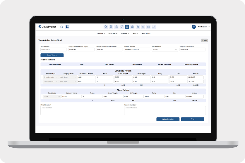Track metal issued to karigars and manage returned finished jewelry with complete transparency